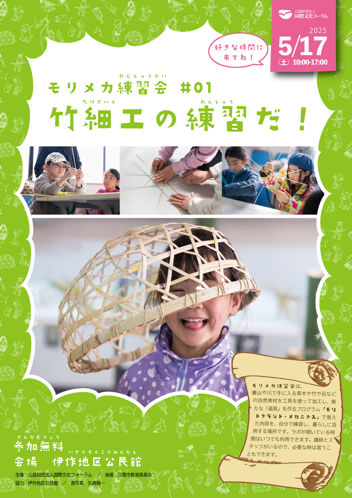 モリメカでは、2025年3月に竹編みと竹ドーム作りを行いましたが、今後の講座でも竹編みを応用した講座を開催する予定です。