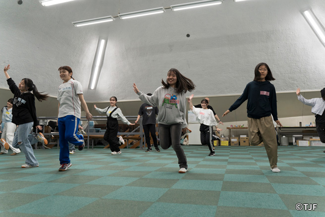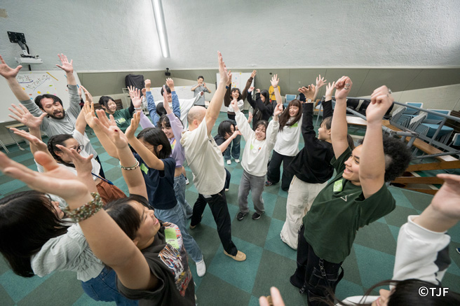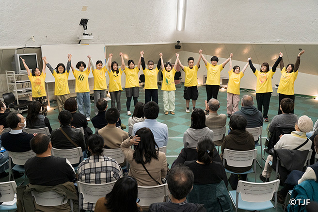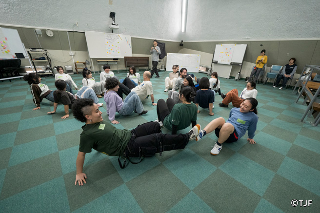 TJFは2025年3月27日(木)~30日(日)の日程で、東京都八王子市において多言語・多文化交流「パフォーマンス合宿 in 東京」、通称「とうきょうPCAMP2025」を開催しました。言語、文化、地域、学年、特性など、さまざまな面において多様なバックグラウンドをもつ14名の中高生年代(14~19歳)が参加し、3泊4日間、寝食を共にしながら、演出家、俳優、振付家、ダンサーからなるファシリテーターチームの伴走のもと、パフォーマンス(演劇やダンス、ことばや身体表現からなる作品)を創作し、最終日に同会場にて発表しました。発表会には参加者のご家族、一般教育関係者、芸術活動関係者、報道関係者など、計29名が観覧しました。
