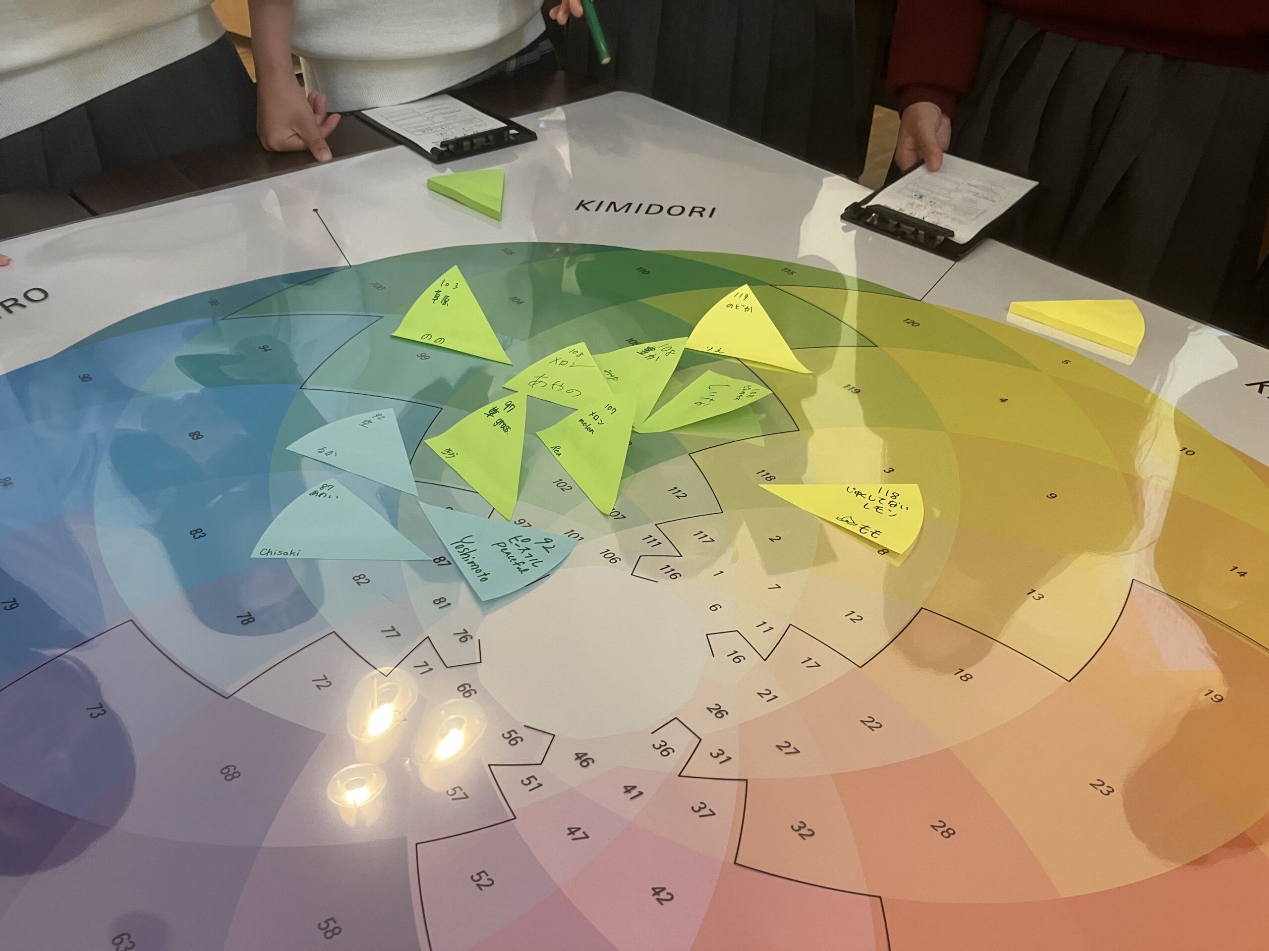 次に、色とことばを使った活動を実施しました。まず色をつかった活動からはじめたのは、色がことばよりも個人の感覚的なイメージを自由に表現でき、思考の偏りにとらわれにくいからです。また、受け手の解釈や批判にさらされずに、率直に表現しやすいという利点もあります。
