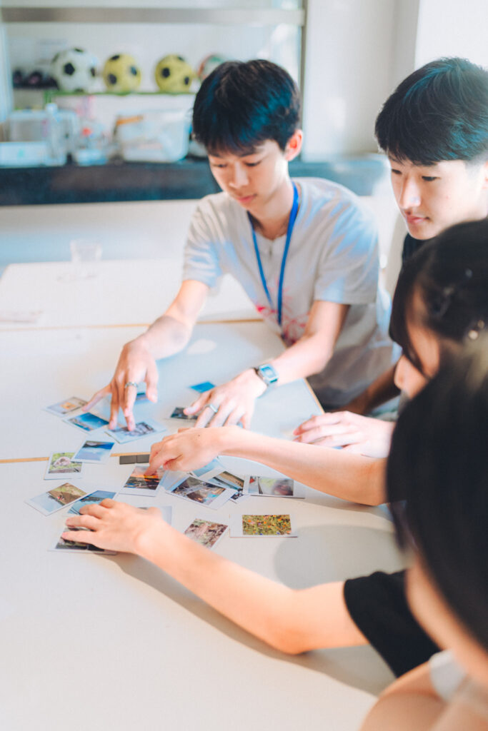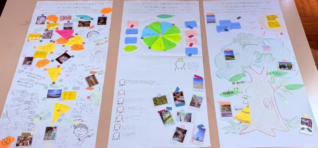 さらに、事前課題として提出した、「地球」「希望」「未来」をテーマに撮影した写真を使ったゲームを実施。インスタントカメラで現像された写真から、撮影者の意図を仲間と話し合うことで、活発な意見交換が生まれました。その後、自分と仲間の写真を色相環シートの色で表現し、言葉ではなく色でイメージを共有する活動を行いました。最後に、これまでの活動で出てきたイメージを写真、色、言葉を使って大きな紙にまとめました。