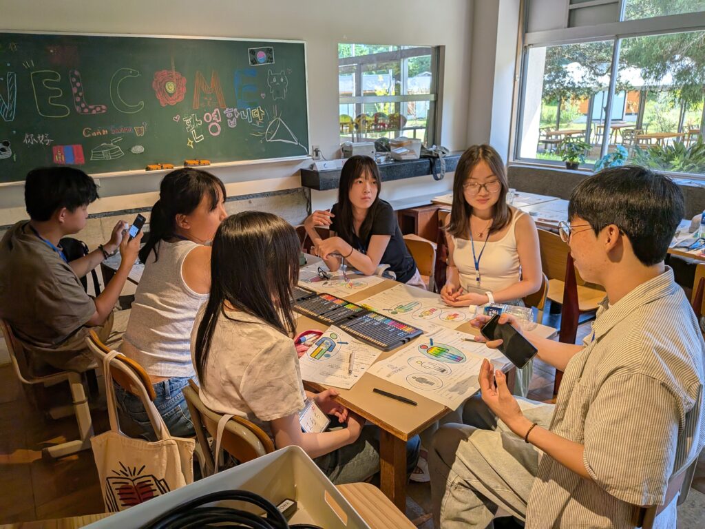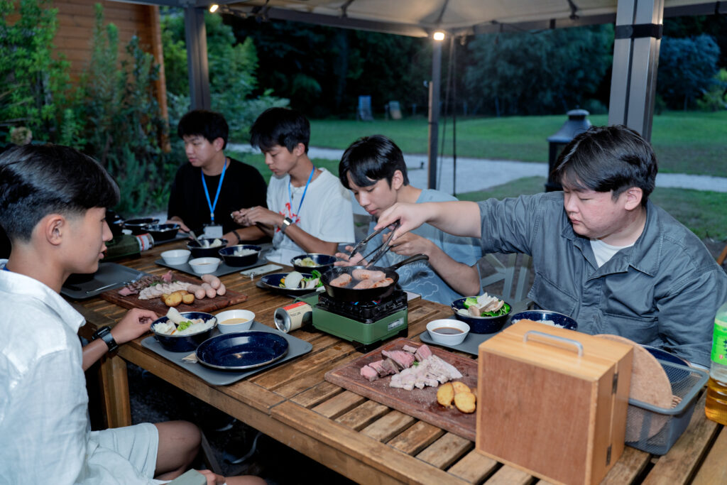 その後、宿泊部屋ごとのグループにわかれて施設探索活動を実施しました。日本語、韓国語、中国語、モンゴル語で表記されたキーワードを集めながら施設を巡るうちに、各言語のキーワードの意味を教え合うなど自然とグループを超えた協力が生まれました。集めたキーワードから連想ゲームをすると、同じことばからスタートしても、たどり着くことばや、添える色がチームや人によって異なることを体験。この活動を通じて、参加者たちは仲間の多様性を再認識しました。夕食はバーベキューで、夜風の気持ち良い快適な環境の中で交流を楽しみました。