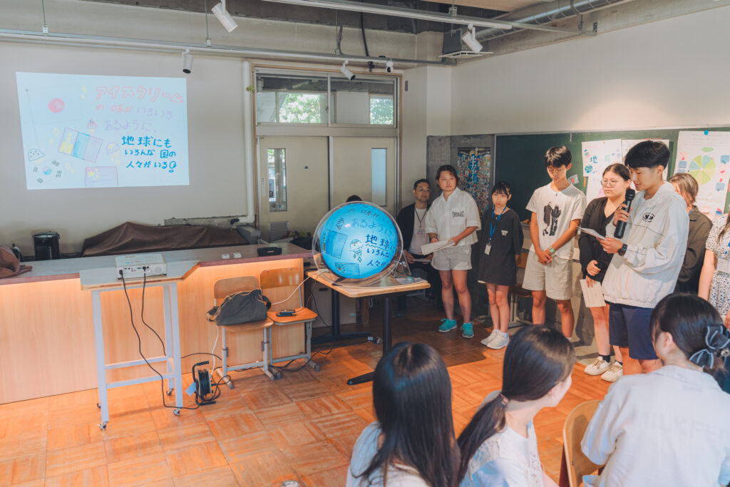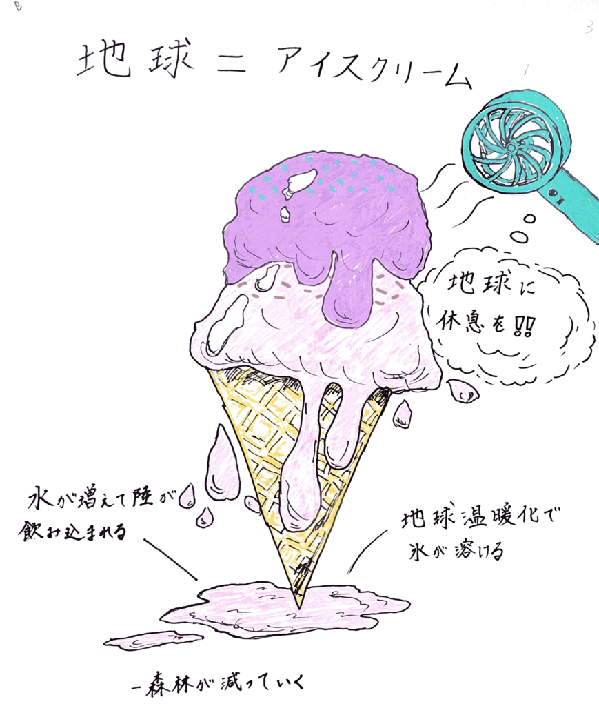 午後の発表会では、各チームが「私たちの地球の希望未来像」を発表し、続いて一人ひとりが「私の未来像」を紹介しました。 「私たちの地球の希望未来像」では、内容も発表方法もチームごとに個性が表れました。あるチームは、地球をアイスクリームになぞらえ、地球が温暖化で溶ける様子を絵で表現。「アイスクリームも冷やせば形を留められるように、地球も管理して休息させれば次の世代につなげられる」と訴えました。また、「アイスクリームのようにあっという間に食べてしまうのではなく、地球の資源を使い切ってしまわないようにしたい。、自分たちは消費者ではなく守る立場になりたい」との考えを絵を使って表現しました。