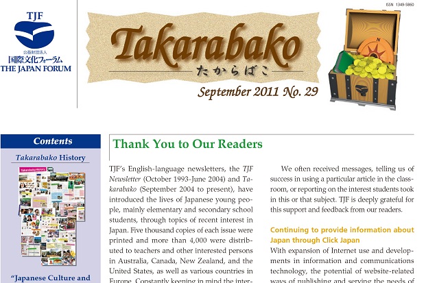 日本語を学ぶ海外の中高校生や、日本語教師の方々に、日本の文化や人々についての情報をお届けする英文情報誌『Takarabako』。年4回発行しています(6、9、12、3月)。