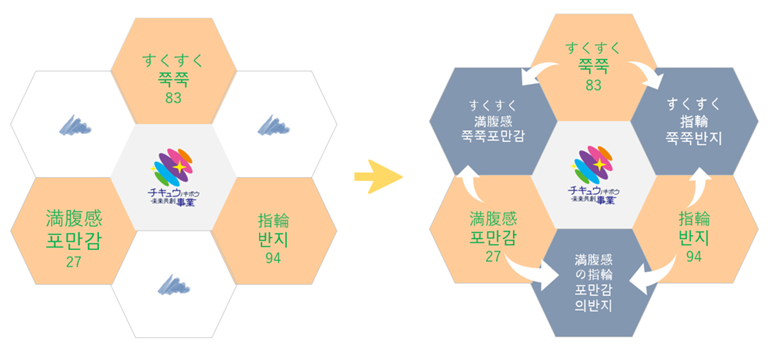 - グループ活動に移り、各自が選んだ色の番号と名付けたことばを付箋に書き、二つの中から一つ選んでワークシートの赤いサインペンでマークされた所定の枠に貼りました。 (例1)