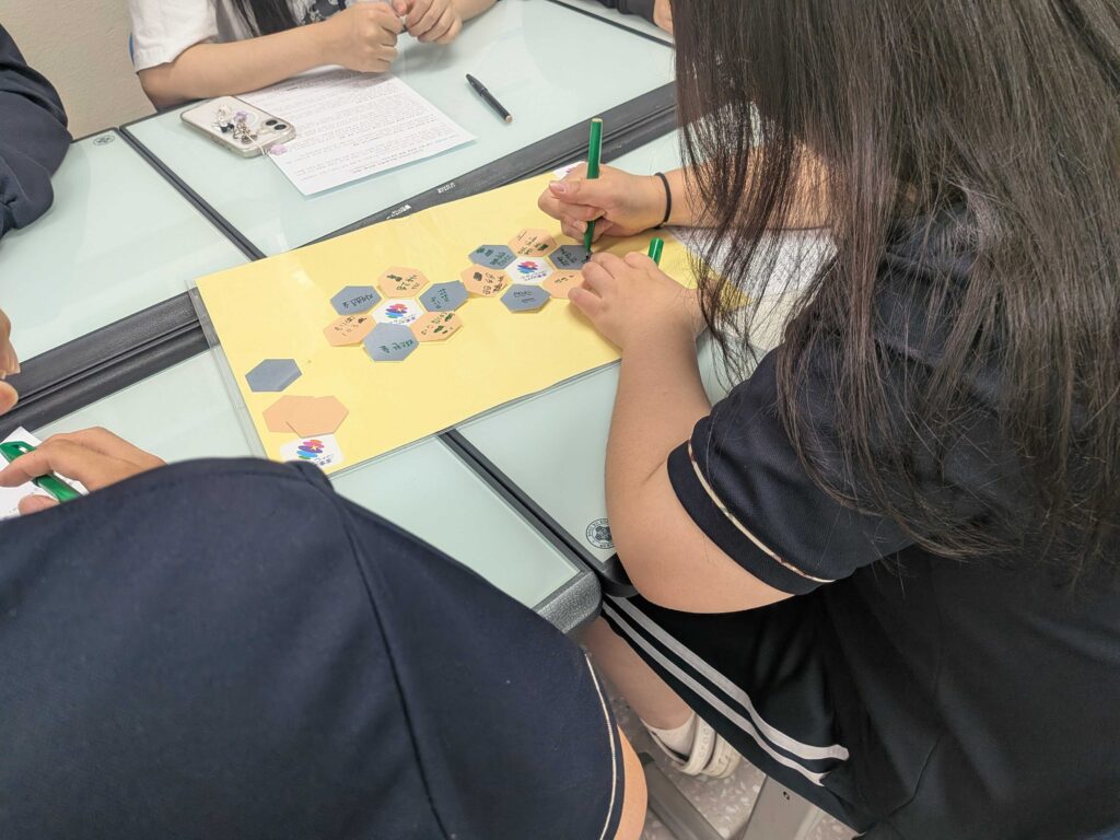 全体に向けて発表するのではなく、グループに1~2名の説明者を残し、それ以外は席を立って別のグループのワークシートを眺めたり、説明者に質問したりする巡回形式で行いました。