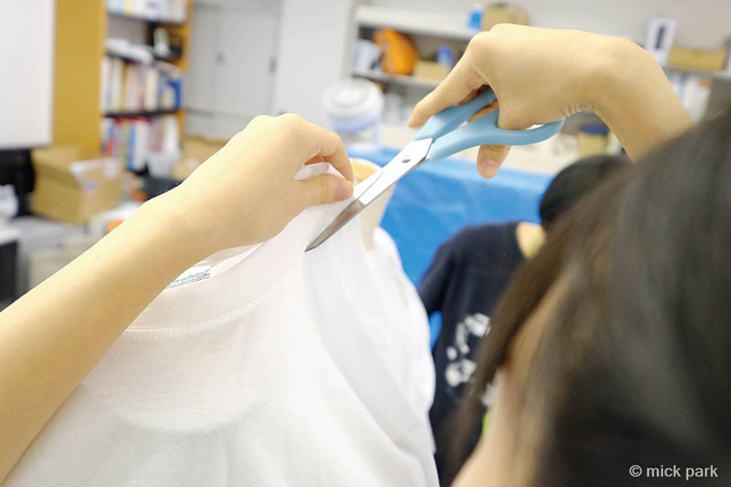 2017 年度は、舞台衣装家や探究学習のサポートをしている高校の先生とチームを組み、「ことばの世界を服で表現してみたら?」を実施。4日間かけて、自分が選んだ詩を舞台衣装家の視点などさまざまな角度から味わって、その世界に立つ自分に着せたい服を考えました。白いT シャツ5枚を使い、完成させた服を着て詩を朗読しました。