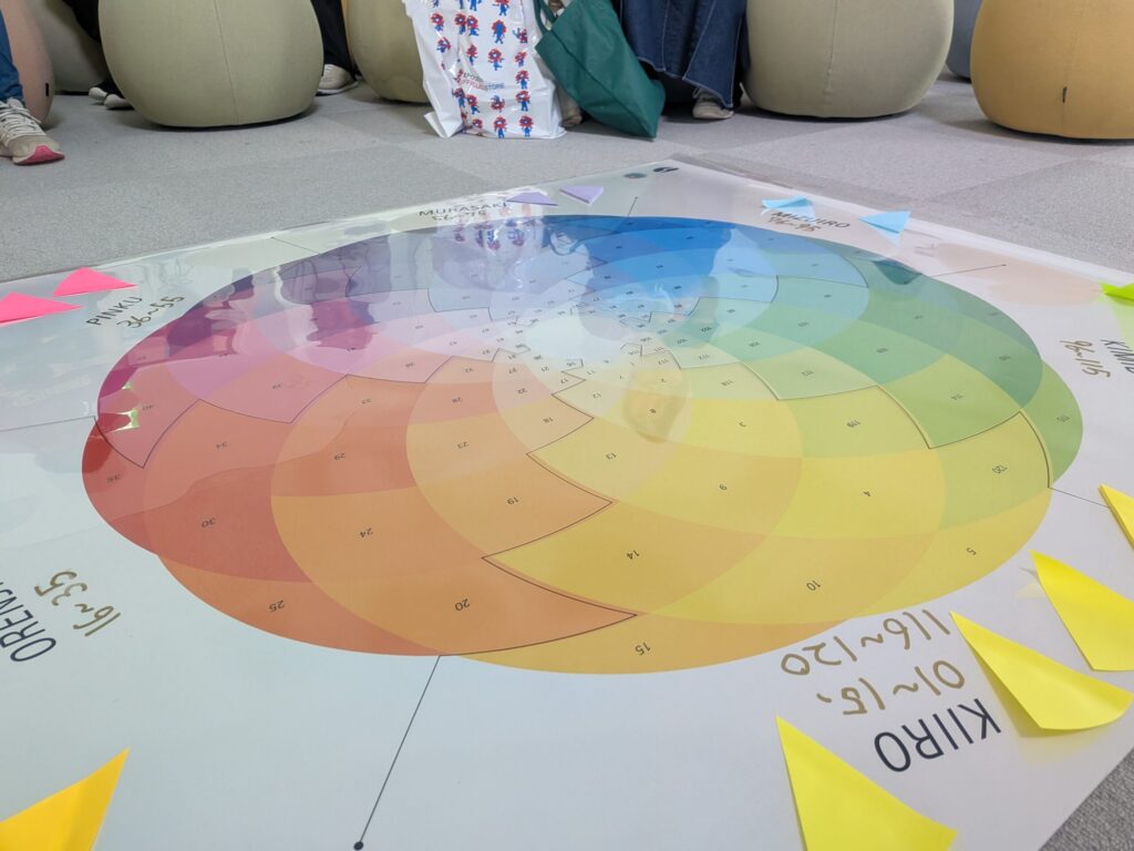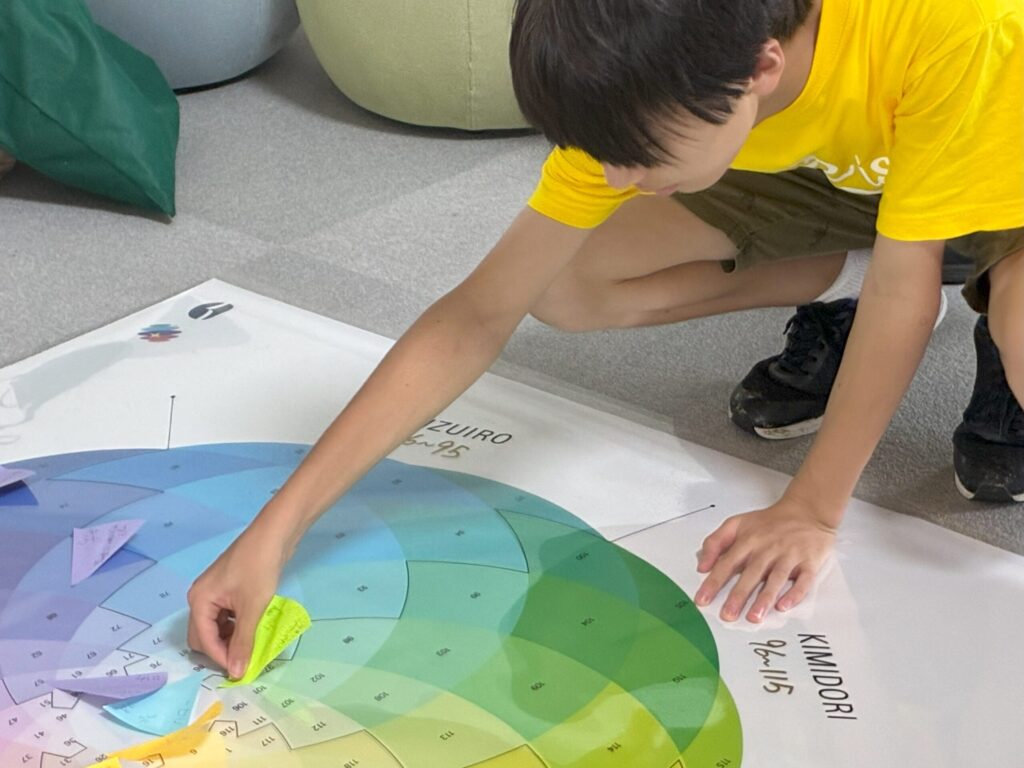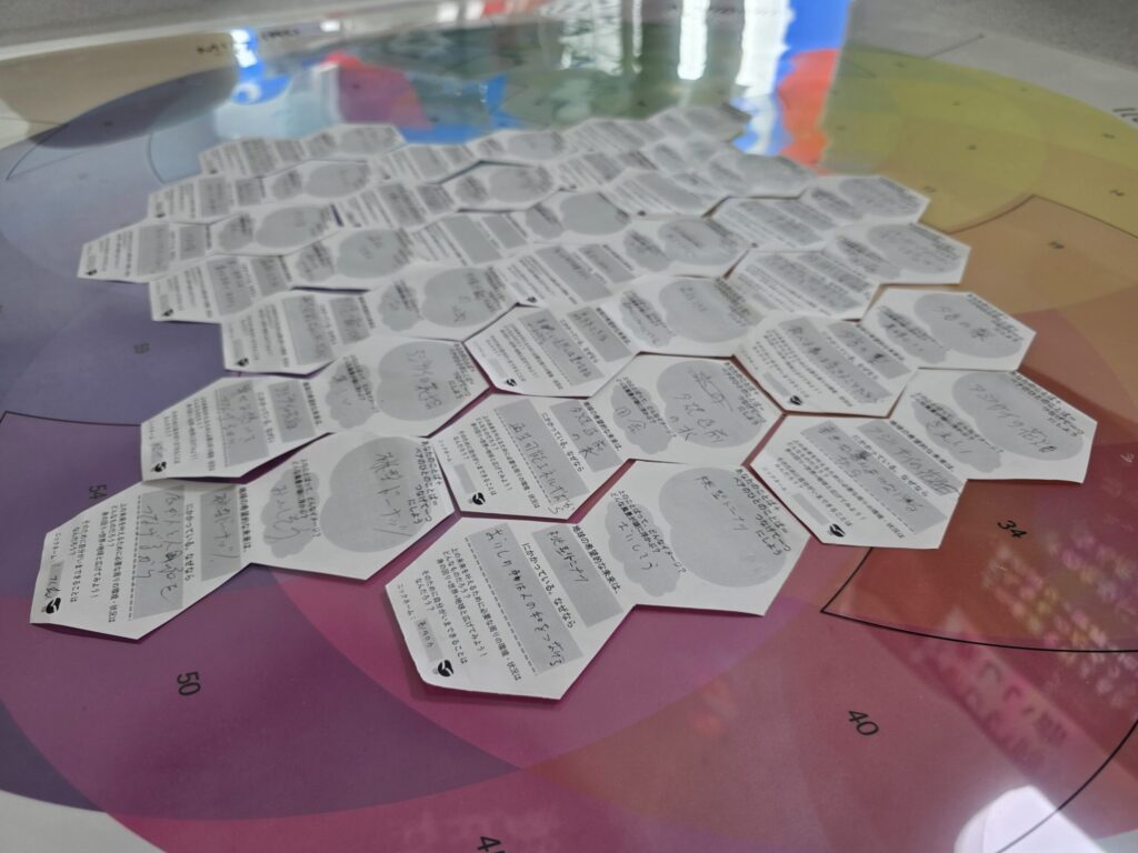 ペアで紡いだ未来の物語を、全体で共有します。六角形を2つつないだ形のワークシートを、色相環図シートの上に並べると、ぴったり隣とつながります。その様子はまるで、それぞれの物語にもつながりがあり、多様性が育んだ未来の可能性のように美しく見えました。