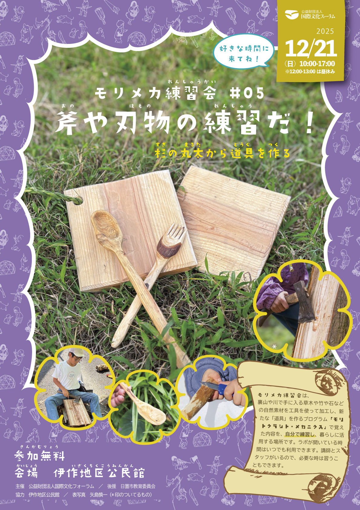 これまでのモリトクラシト・メカニクス講座で扱ってきた斧やナイフ、ノコギリ、ナタなどの刃物の練習をする回です。
