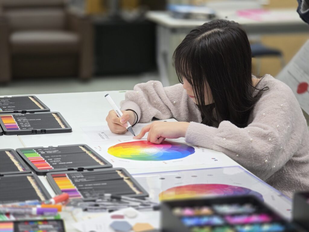 自身の過去、現在、未来を色相関図の3つの色で表現し、自己紹介を行いました。さらに、選んだ色の番号を足し合わせて、「4つめの色」を導きだします。この「偶然によって決まった色」から、自分の希望未来を表現する言葉を考えました。 偶然の力を借りることで、普段の思考回路からはずれた、ユニークな視点の希望未来像が引き出されました。