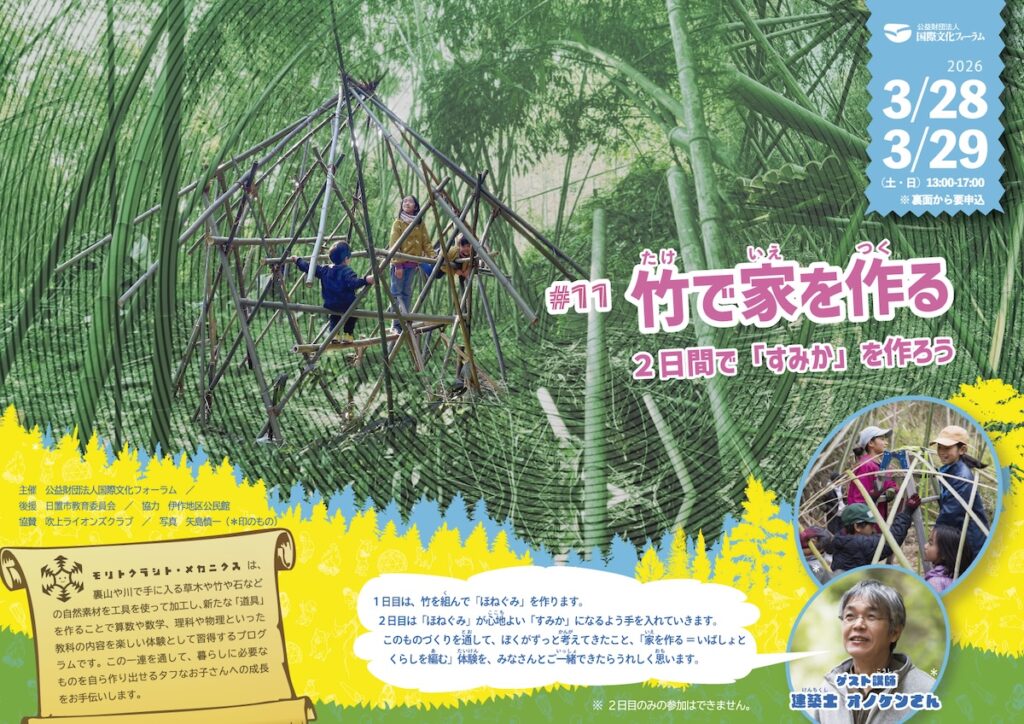 建築のプロのオノケンさんをゲスト講師にお招きし、竹を組んで家の形を作り、形ができたら、心地よい「すみか」にするために必要なものは何かを考え、竹林にあるものを使って手を加えていきます。