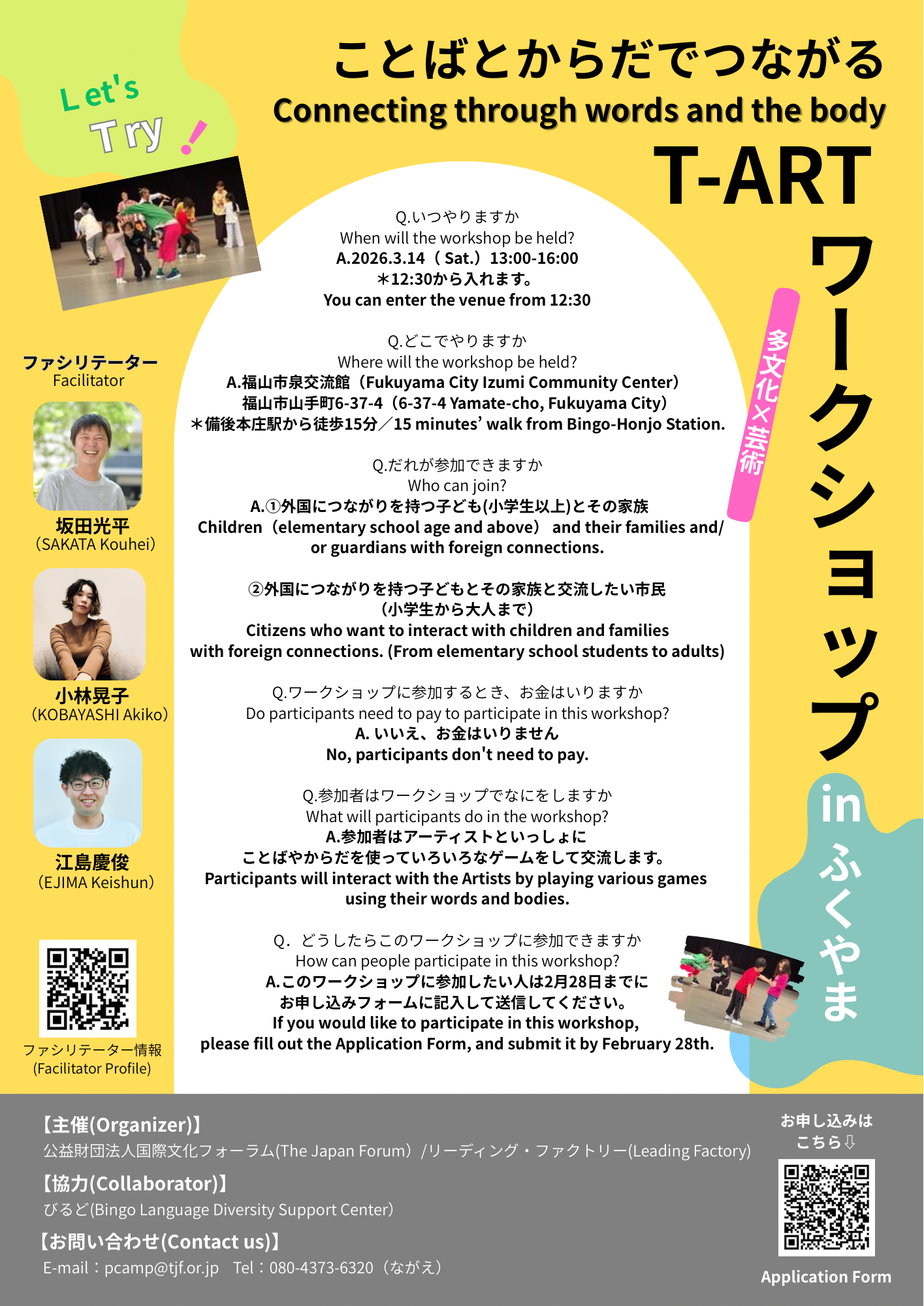そして、2025年12月以降、T-ARTネット・メンバーと共に各地域で演劇やダンスなどのパフォーマンスアートを中心とするワークショップを企画・実施しています。その一環として、3月14日(土)、広島県福山市において、外国につながる子ども(小学生以上)及びその保護者、「外国につながる子ども及びその保護者」と交流したい市民(小学生から大人まで)を対象とするT‐ARTワークショップを開催します。