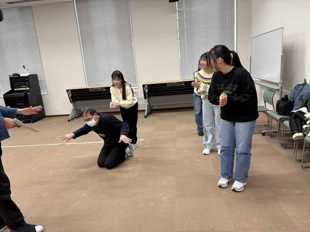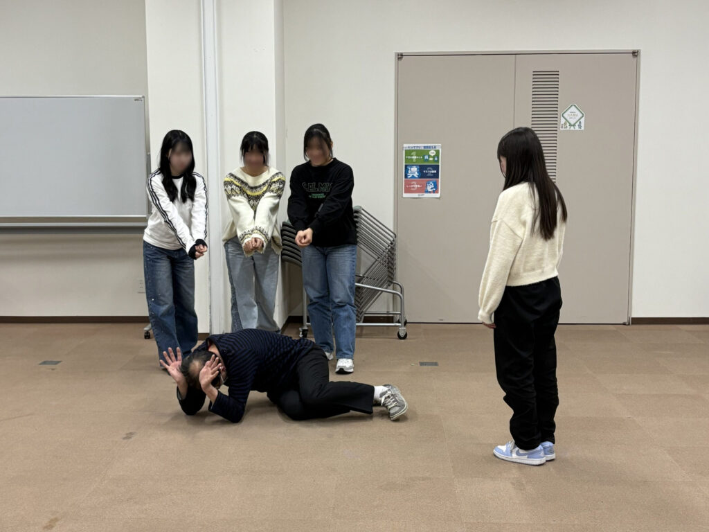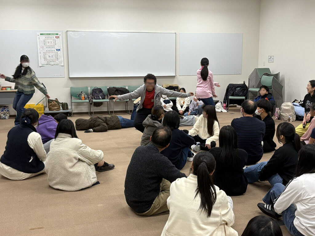 ワークショップ③では、ことばだけでなく、動きや表情などさまざまな方法で気持ちや考えを相手に伝える、相手から受け取る体験を大切にし、コミュニケーションの幅を広げることをねらいとしました。グループワークでは、抽象的なテーマやことばをどのような動きで表現すれば相手に伝わるかを考え、試行錯誤を重ねながらチームで一つの作品をつくり上げました。その過程を通して、協力して創り出す楽しさや、共に表現する面白さを感じてもらうことを目指しました。