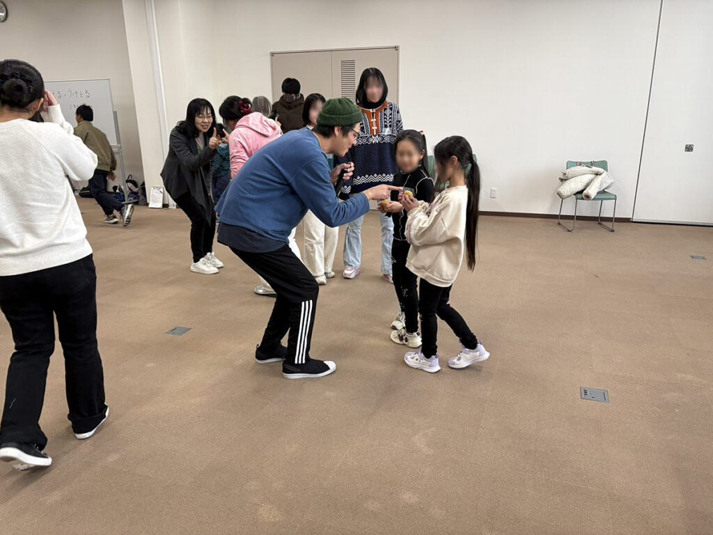 ワークショップ①では、多様な文化背景をもつ参加者同士が一緒に活動する中で、互いを知り、安心して関わり合える関係づくりのきっかけとなることを目指しました。子どもたちが身体を自由に使って表現する楽しさを知り、仲間と協力しながら創作し、それを表現する喜びを感じることをねらいとしました。