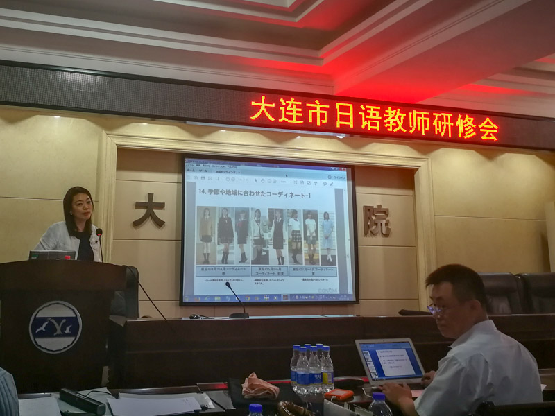 2018年度は、共同事業の一環として「制服」をテーマにしたプロジェクト「わたしたちの学校の制服をデザインしよう」を実施することにしました。これは、大連市内の中高校の日本語の授業で、生徒が自分の学校の特徴を考えて制服をデザインし、日本語でプレゼンするものです。デザインやそのプレゼンを通して、日本語の運用能力だけでなく、思考力、想像力、プレゼン力を磨くことを目標としています。5月に教師研修、6月から9月にかけて日本語の授業で実施し、11月にプレゼンを行うという半年にわたるプロジェクトです。