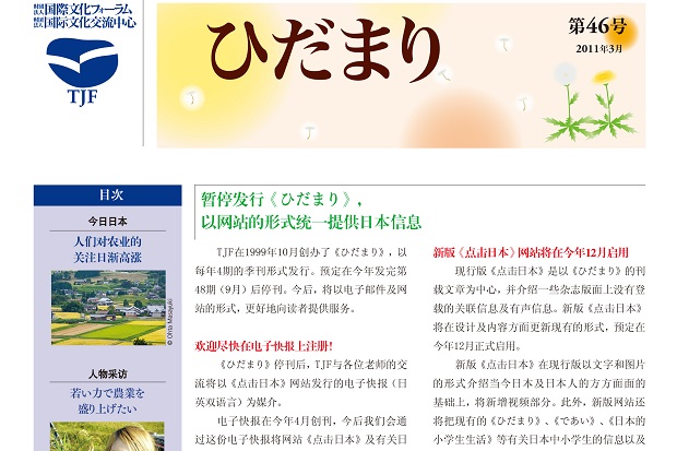報告 2011年4月19日 「人们对农业的关注日渐高涨(高まる農への関心)」―中文情報誌『ひだまり』第46号PDFを掲載しました 日本語を学ぶ中国の中高校生や、日本語教師の方々に、日本の文化や人々につい ての情報をお届けする中文情報誌『ひだまり』。年4回発行しています(6、9、12、3月)。今回のテーマは「高まる農への関心」です。 ■今日日本 人们对农业的关注日渐高涨 ■人物采访 若い力で農業を盛り上げたい 関連リンク