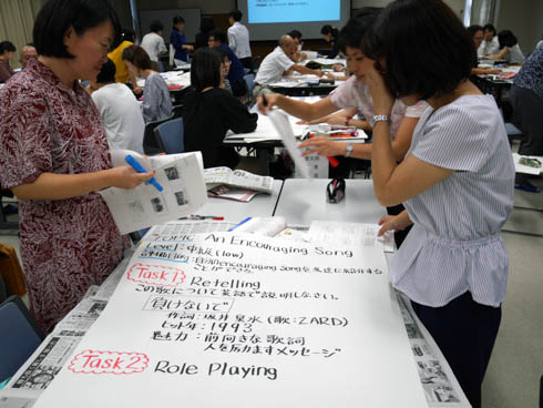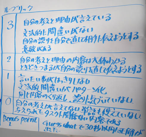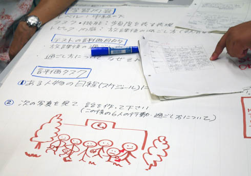 パフォーマンス評価についてのレクチャーの後、話す活動を主とした評価づくりを行いました。4人グループにわかれ、「初級中」「中級下」等のレベル、「レストランで注文する」「意見を述べる」等のタスク・機能、「学校」「家族」「経済」等のトピック、「ものがどこにあるかを聞くこと、言うことができる」等の評価目的を設定。それから、インタビューやロールプレイ、リテル(与えられたキーワードや絵などをもとに、自分のことばでストーリー化して説明する)などの具体的な活動を考え、ルーブリック(評価基準)をつくりました。