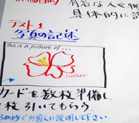 あるグループは、海外の観光客に沖縄のよさを伝えるために「沖縄の有名な人やものについて具体的に説明できる」という目的を設定しました。ハイビスカスなどが写った写真を数枚用意し、生徒は自分が引いた写真について、”This is a picture of〜”に続けて説明します。また、沖縄出身の具志堅用高について、生年月日、出身地、職業、取ったタイトル、好きな食べ物などを説明する活動を考えました。