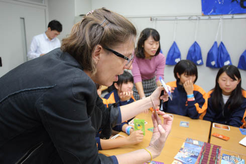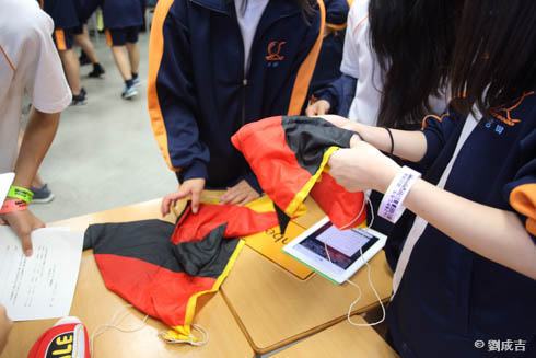 ドイツ語は、iPadを利用したオリエンテーション形式のゲームと、用意してきた看板やシートなどを利用したアナログなクイズをドイツ語に触れながら行いました。オリエンテーションゲームは、アクションバウンドというアプリケーションを利用したもので、実際に場所を移動しながら課題を解き進む宝探し的な要素のある活動でした。他に、たくさんのロゴの中からドイツ企業ではないものを選んだり、袋の中のドイツで発明された生活用品を手探りであてたり、デジタル機器をつかわないアナログな活動も行われました。これらを数人のチームで協力しながら進め、最後はお土産にドイツ語のかかれたバッジがプレゼントされるなど記憶にのこる時間となりました。