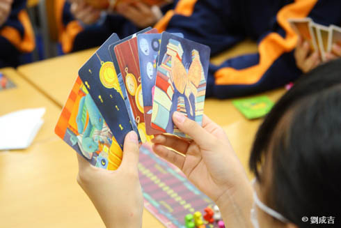 フランス語は、DiXitというボードゲームを使った活動でした。DiXitは各プレイヤーが6枚ずつメルヘンチックなイラストが描かれた手札を持ち、一人ずつ交代で語り部となって進めるゲームです。語り部のキーワードをもとに全員が出すカードの中から、語り部の一枚を当てる2010年のゲーム・オブ・ザ・イヤーに輝いたフランス発のゲームです。語り部のキーワードを講師がフランス語にして書いたり話したりしてくれるのを見聞きながら進めました。ゲーム自体の楽しさはもちろん、キーワードのフランス語もきっと心に残ったのではないでしょうか。他に2種類あるフランスの菓子パンのうちのひとつをフランス語で注文するという活動も行われ、舌でもフランスを堪能する時間となりました。