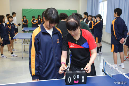 中国語は体育館ギャラリースペースで中国語に触れながら卓球を行いました。点数を中国語でカウントしたり、中国語で応援したり、6人が1グループを作り、8チーム対抗のダブルスゲームを行いました。卓球部の生徒が講師の先生に挑むシーンもありましたが、いいようにあしらわれるなど、卓球王国中国の実力に触れる機会となりました。楽しい中で覚えた中国語を口ずさむ生徒の姿が印象的でした。