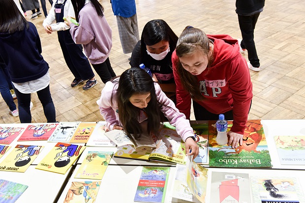 都内で多言語図書がもっとも充実している都立多摩図書館から借りたものを含め、韓国語、タガログ語、中国語、ネパール語、ヒンディー語、ポルトガル語で書かれた絵本と、これらの言語に訳されている日本語の絵本も合せて会場に展示しました。中国出身の高校生が展示の絵本を使って中国語学習中の日本人仲間に教える場面も見られました。