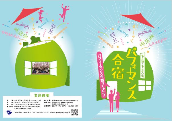 TJFが2017年度より毎年の春休みに実施している多言語・多文化交流「パフォーマンス合宿」の参加者募集が9月2日から始まりました。これまでに参加した学校、TJFの事業と関係の深い学校、一部の多文化共生支援団体など宛てに募集書類を送付しました。その他ご関心のある学校、機関、個人には随時募集書類を送付しますので、ご希望の方はこちらからお問合わせください。