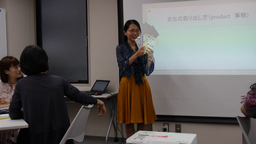今回の研修のテーマは「文化の捉え方」でしたが、まずは「文化ってなんだろう」を皆で話し合うことから始まりました。日本の文化と言われて浮かぶものは?との問いには、目に見えるものから、見えない部分まで様々な答えが出されました。