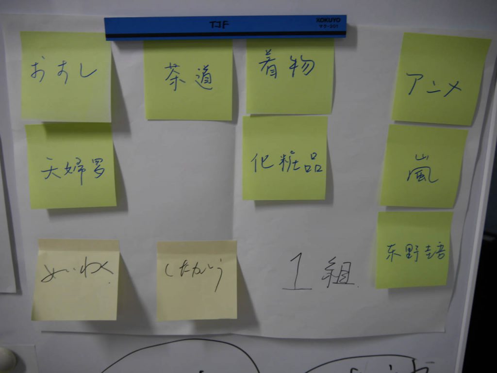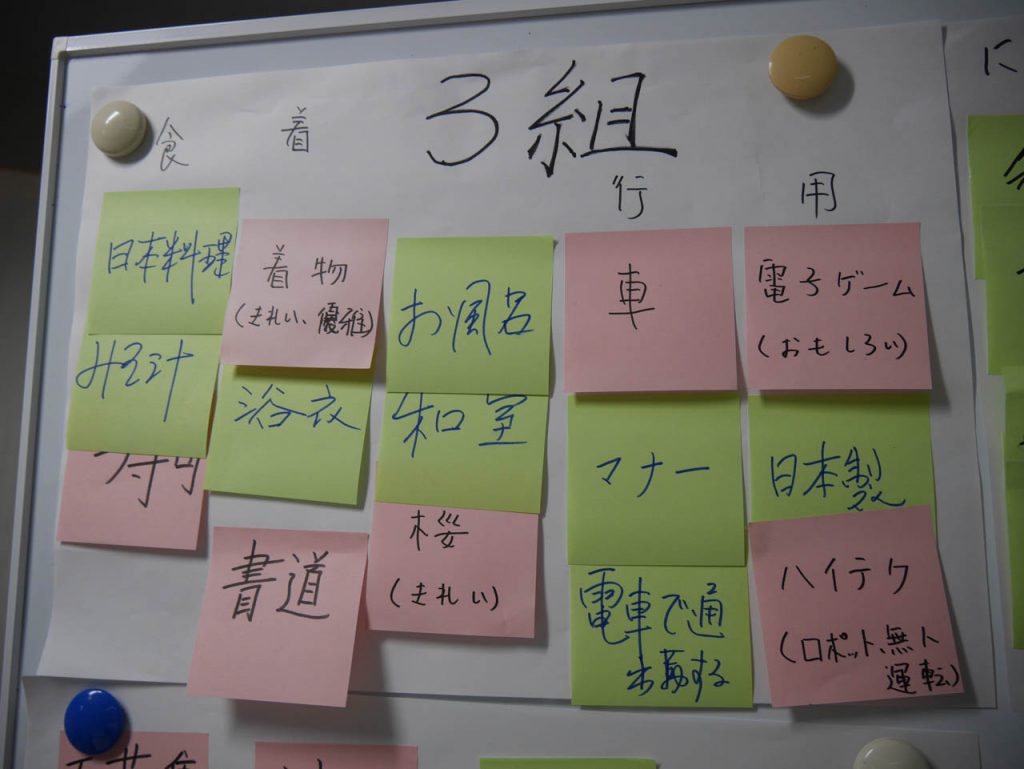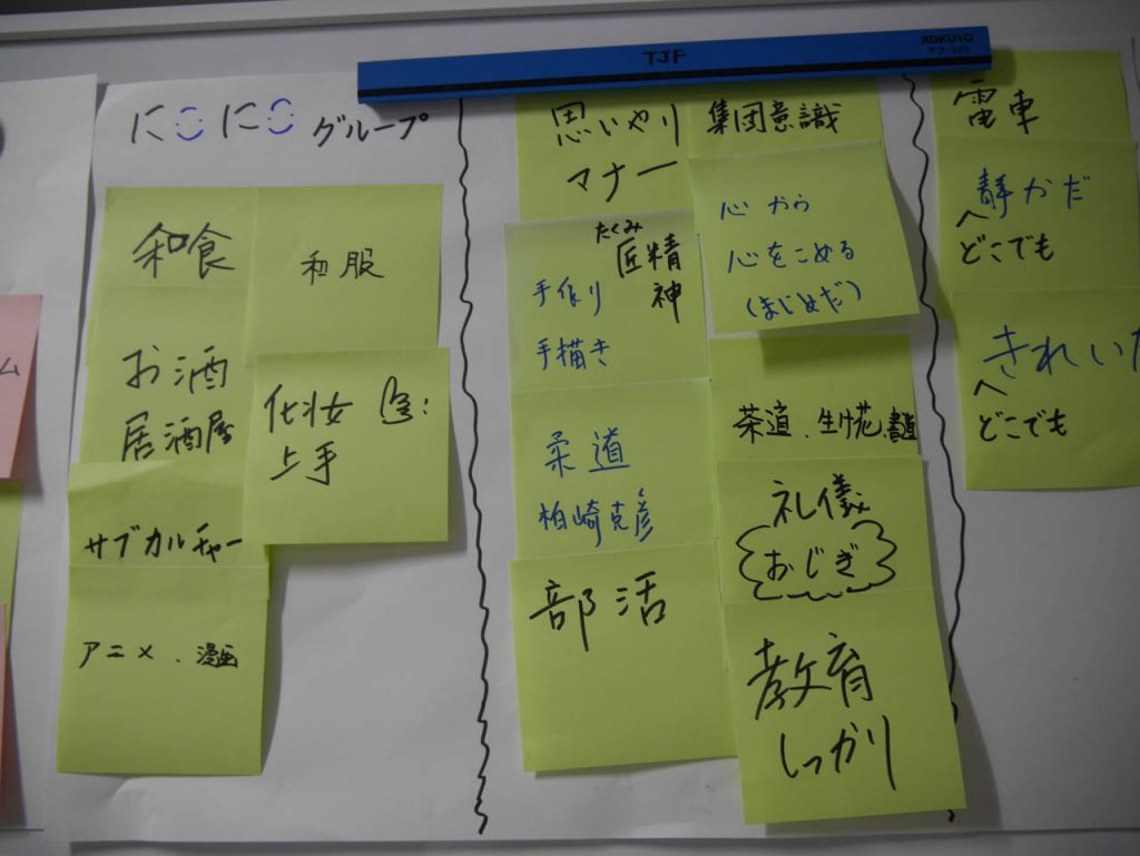 今回の研修のテーマは「文化の捉え方」でしたが、まずは「文化ってなんだろう」を皆で話し合うことから始まりました。日本の文化と言われて浮かぶものは?との問いには、目に見えるものから、見えない部分まで様々な答えが出されました。