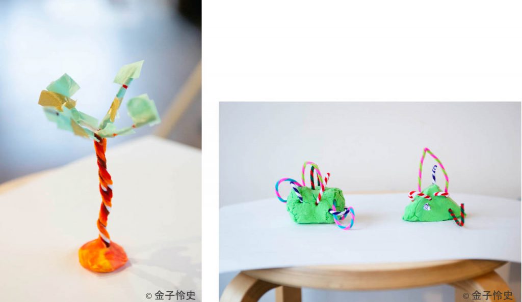 中高生たちは、約2時間かけて4作品の鑑賞を終えたあと、自分のなかに湧きあがってきた感覚や考えたことを、粘土や手芸用品、写真などの非言語の媒体を自由につかって表現。完成した互いの作品を鑑賞し、印象や発見したこと、作品に込めた意図などを語りあいました。