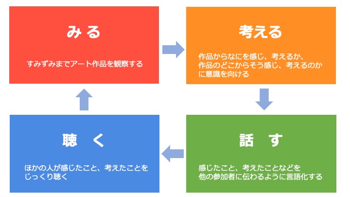 対話型鑑賞は、ACCがニューヨーク近代美術館のVisual Thinking Curriculum(VTC)をもとに開発したArt Communication Project(ACOP)という美術鑑賞の手法にそって進みました。「みる」→「考える」→「話す」→「聴く」の4つを繰り返しながら、作品、自分自身、ほかの参加者との対話を重ねていきます。