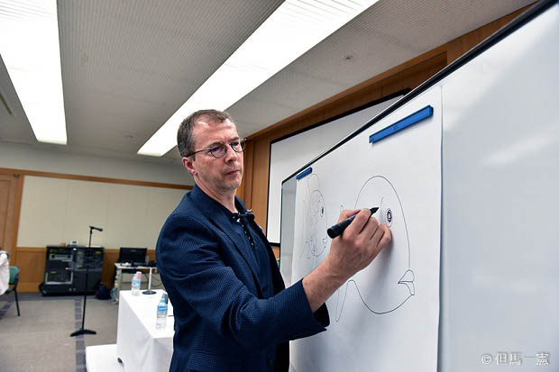 最初にフィスター氏からスイスでの多言語状況などについて話を聞いた後、魚の描き方のレクチャーを受けました。さまざまな魚を描くために、魚の形や大きさ、うろこやひれの形、さらには喜怒哀楽の感情、色をどのように描き分けるのか、実演を交えた話でした。
