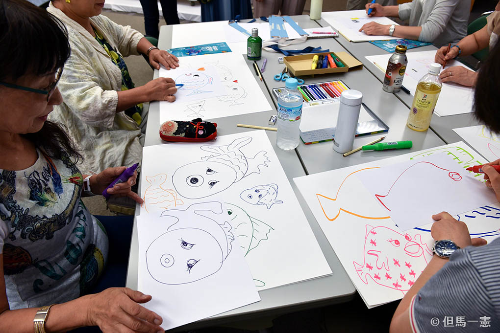 レクチャー後は、参加者が自分を表す魚を描きます。フィスター氏の「一般的な魚の形にとらわれなくていいですよ。自由な発想で描きましょう」ということばを受けて、帽子を被った魚、ト音記号の形をした魚、ハートのうろこをもった魚などさまざまな魚ができあがりました。