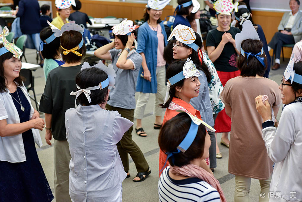 描き終わると、切り取った魚を頭につけ、海に見立てた会場を自由に泳ぎまわります。ひとしきり泳いだ後、ひとりずつ自分がどんな魚かをことばと動作を交えて発表しました。
