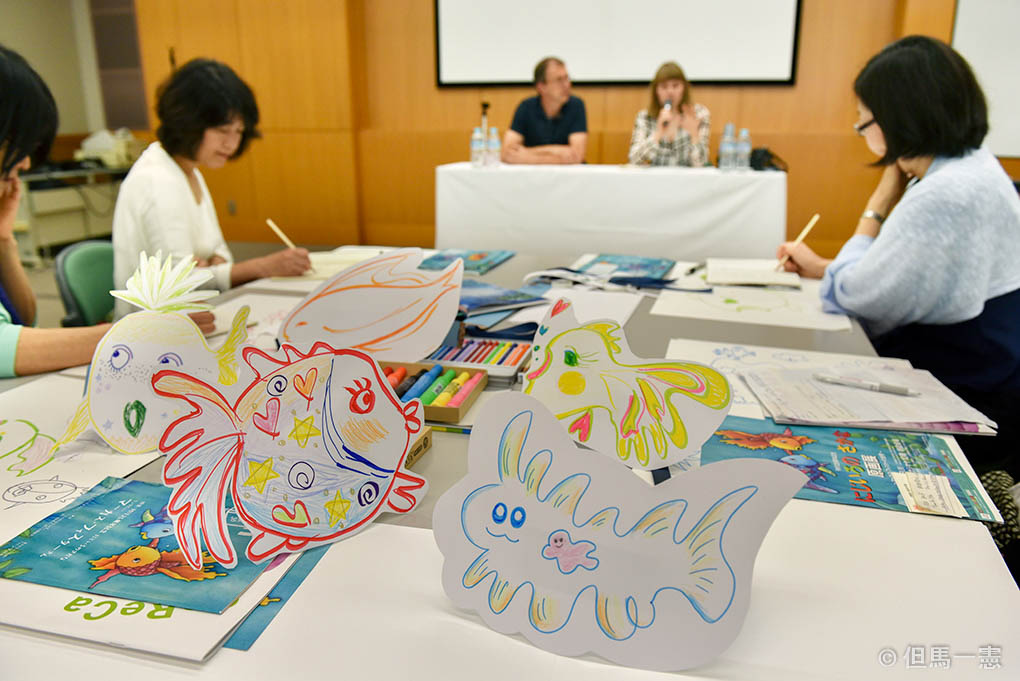 2017年8月12日、TJFの設立30周年記念事業の第一弾として、『にじいろのさかな』シリーズの著者、マーカス・フィスター氏によるワークショップを実施しました。絵本を使った教育活動に関心のある方、40名の参加がありました。ワークショップでは、さまざまな魚を描くことを通じて、多様な存在がいること、多様性のある社会の豊かさを体感する活動を実際に体験し、参加した方々が関わっている教育活動に生かしてもらうことをねらいとしました。