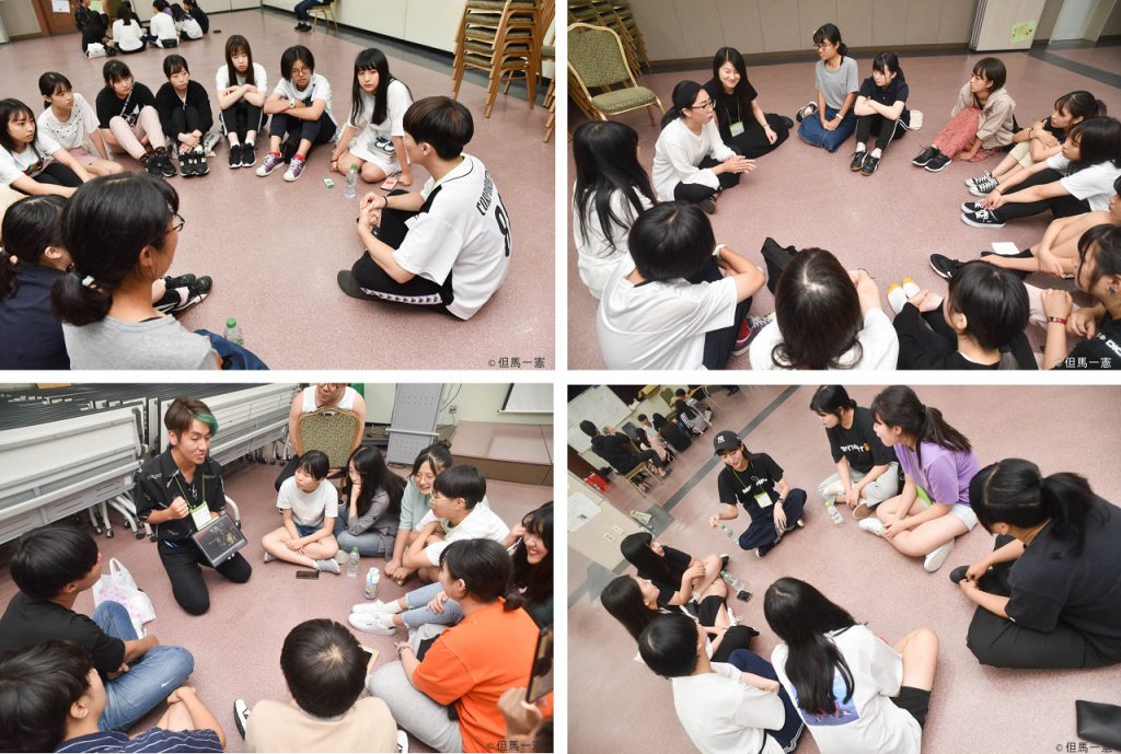 その後、宿舎の会議室でダンス発表のリハーサルを行いました。3つの部屋に分かれて2チームごとに互いにアドバイスし合い、課題を明らかにしたり、自分の不安も出したりしました。その後、仲間と力を合わせてしあげの練習に夜遅くまで取り組みました。