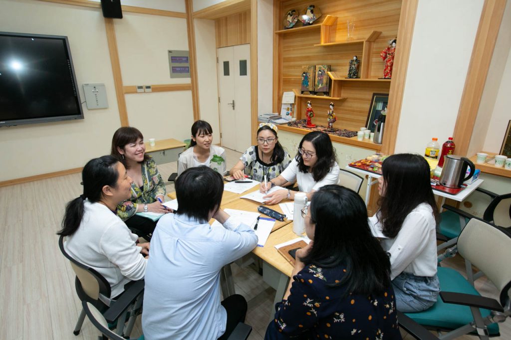そこで今回は、そのフォローアップとして、7月の研修に参加した先生方(ハルビン市朝鮮族第一中学、ハルビン市第8中学、大連市第35中学、上海市工商外国語学校、中山市外国語学校、黒龍江省教育学院日本語指導主事、大連市教育学院日本語指導主事)が上海に再集合し、2日間の研修を行いました。講師も7月の研修と同じく、稲原先生と武田先生にお願いし、研修を受けてから学校の現場で感じたことや実践できたことを共有しながら解決をめざしました。
