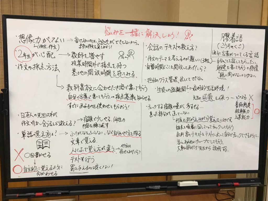 授業中の悩み、採点や評価方法など先生の授業時間以外の悩み、また、時間をどうやりくりするかなど、先生方の悩みは多岐にわたりました。ベテランの先生から新任の先生まで一緒になって持っているアイディアを出し合い、解決をめざしました。