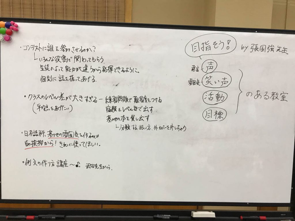 中学1年を担当している先生からは、体験の場にあるものを使って遊びながら授業をすることも多いという報告がありましたが、それに対して武田先生は、日本語の学びと結びついていないのではないか、と指摘しました。「この体験が生徒のどの学びにつながるのか」を考えながら授業を組み立てることが重要だと武田先生から伝えられました。