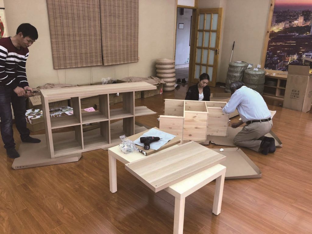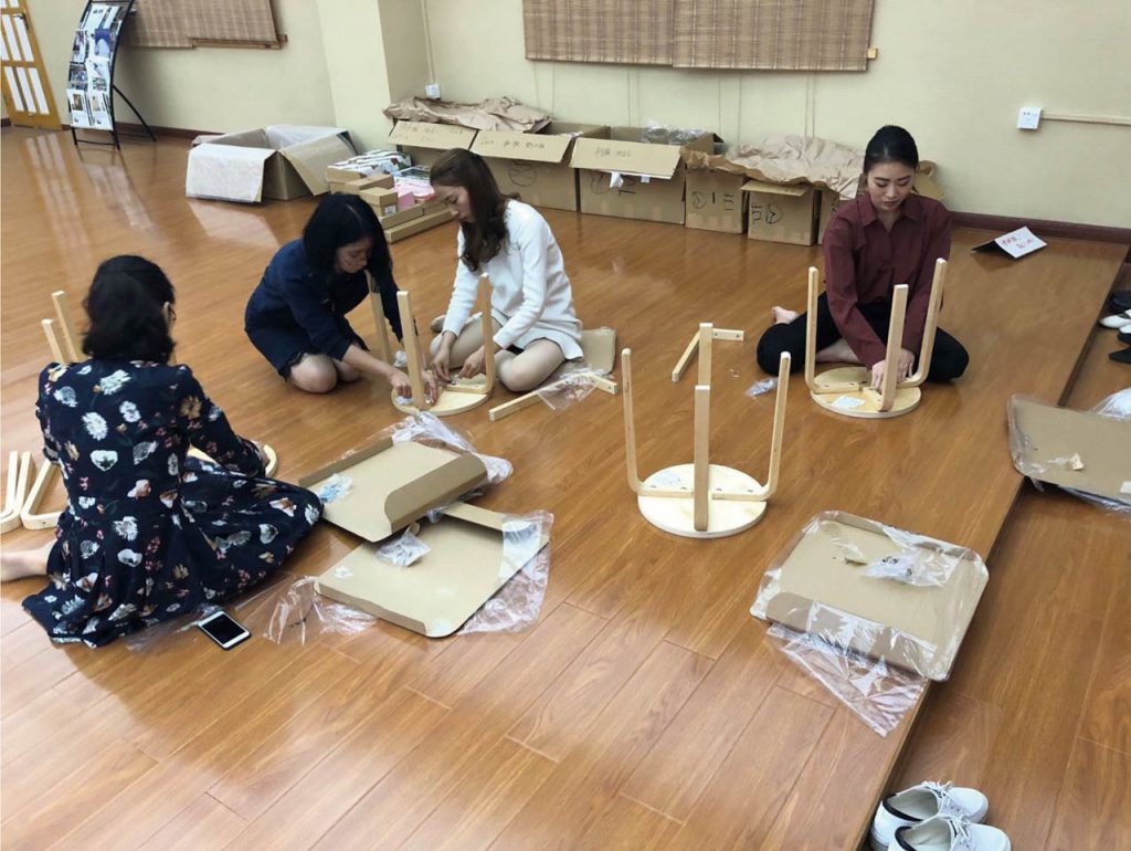 4名の新任の先生が体験の場について詳しく知らなかったことから、外国語部副主任の劉海峰先生に体験の場ができるまでの話をしてもらいました。劉先生は、体験の場の構想段階から、校長先生の承認、視察、内装工事、家具選び、家具設置、飾り付けまで、すべての工程で関わっています。各工程の記録写真を見せながら報告してくれました。