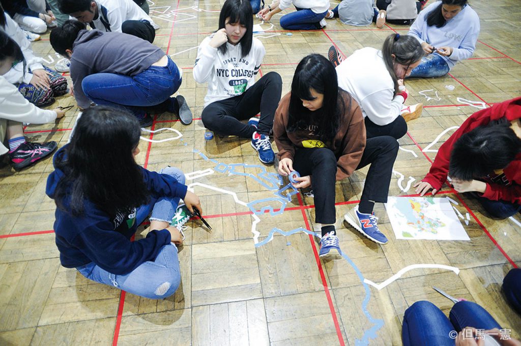 発表会の舞台となる床に白いテープで世界地図を描きます。参加者とつながりのある国・地域の境界線は青テープを貼ります。
