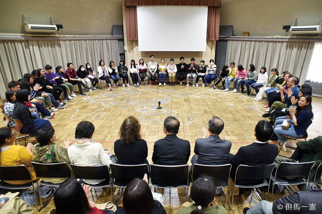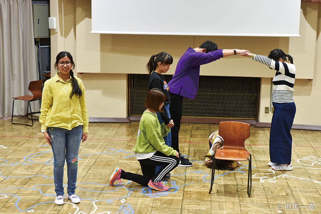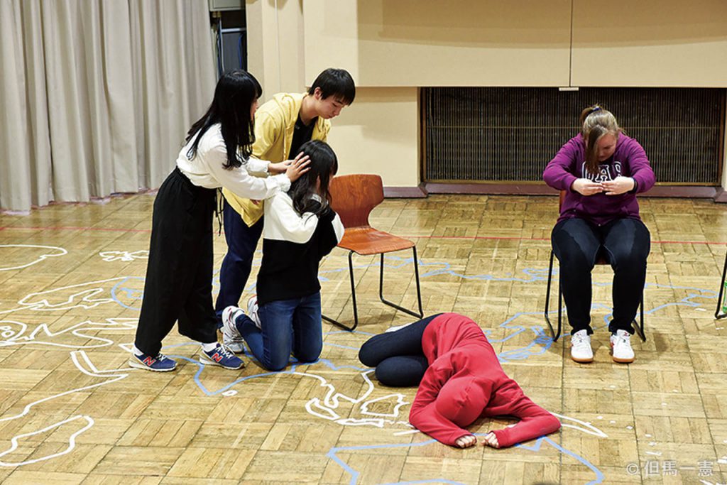 全員で円陣を組み声を出しました。保護者や教師など、関係者を迎えて、いよいよ本番。床の世界地図の上で、一人ひとりが住んだことのある地域を歩く。グループごとに「古い記憶」と6つのテーマの作品発表。自分にとって表現しやすい言語を使い、グループメンバーが日本語でフォロー。最後は、一人ひとりが将来行きたい場所に移動し何をしたいか言います。