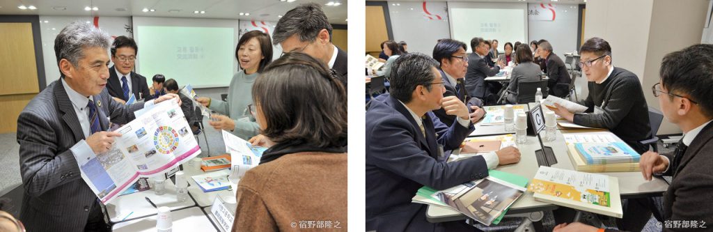 12月の派遣プログラムに参加予定の東京、千葉、兵庫、岡山の5つの高校の校長、教師が参加しました。3つのグループに分かれて、20分程度交流した後はグループをかわり、全員と話ができるようにしました。事前に日韓両言語に翻訳した学校紹介資料を参照しながら、学校の教育目標やカリキュラム、交流に対する考えや意向についてやりとりしました。