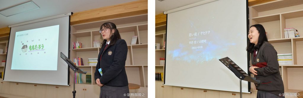 仁川空港に到着後、一番に訪問したのは、日本語を第二外国語科目として設置している廣南高校です。まず日本語教育の状況について同校日本語教師の黄貞姫先生から説明を受けたあと、生徒による童話『桃太郎』の口演と詩の朗唱を聞きました。生徒の流暢な日本語に驚いたのはもちろん、桃太郎にゆかりのある岡山からの参加者にとってはうれしい出会いとなりました。