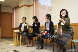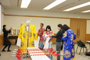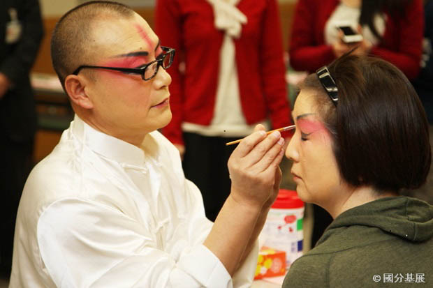日本で活躍している京劇役者、魯大鳴(ルー・ダーミン)さんによる舞台化粧からセリフ、動作まで、目の前で実演しながらの解説は迫力たっぷり。本物の衣装を着たり、楽器にさわったり、京劇を楽しむポイントも聞いて、京劇がぐっと身近になった。