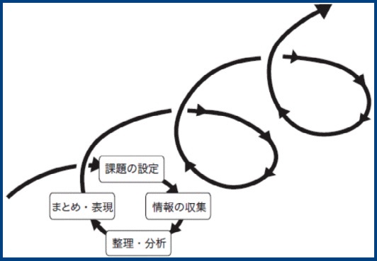 平成30年改訂の高等学校学習指導要領では、「総合的な探究の時間」の設置とともに、「古典探究」「地理探究」「理数探究」等の「探究」を含む科目が設置された。この「探究」の概念は、平成20年改訂版の総合的な学習の時間の解説で提示されたものである(下図)。「課題を設定」した後、その解決のために「情報を収集」し、集めた情報を「整理・分析」し、得られた知見を「まとめ・表現」するという行為が繰り返される学習活動のプロセスを「探究」と表現している。