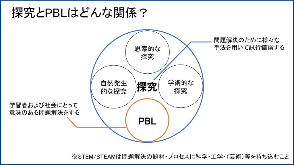 なお、PBLとSTEMまたはSTEAMが同義であると誤解されることがあるが、STEMとSTEAMは問題解決の題材やプロセスに、ScienceやTechnology、Engineering、Art、Mathematicsを持ち込むことである。つまり、学び方というより、学ぶ題材や内容のことであり、その手法としてPBLが採用されることが多い。