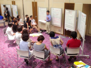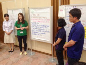 ■生徒が「これから1年間頑張るぞ」、「おもしろそう」と思うような最初の日本語の授業をグループ(4人~5人)で作成することをめざし、日韓の教師が17のグループをつくり、作業を行いました。