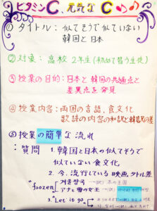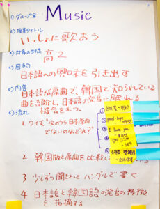 韓国の先生方は、自分のグループにいる日本の先生の学校にゲスト講師として招かれて、はじめて韓国語を学ぶ日本の生徒が対象に1コマの授業をやることになった、日本の先生はグループにいる韓国の先生の学校に招かれて1コマ日本語の授業をすることになったという前提で、授業が終わったあとに「韓国語/日本語ってたのしい!これからも学び続けたい!」と思ってもらうためにどんな授業をするかを考える。