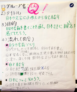 4~5グループで1つの大きなグループを作り、ボードにそれぞれのグループが作成した授業案を貼り、1グループずつ代表がでて説明。質疑応答やコメントをしてもらう。
