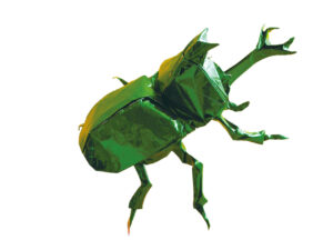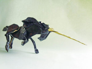 1枚の紙から、頭が生まれ、胴ができ、足ができ、指が折り出されていく。それは生物が細胞分裂を繰り返し生長していくプロセスと似ていると語る。そして、西田さんは何年も、折っては開く、を繰り返し、より完成に近づけていく。